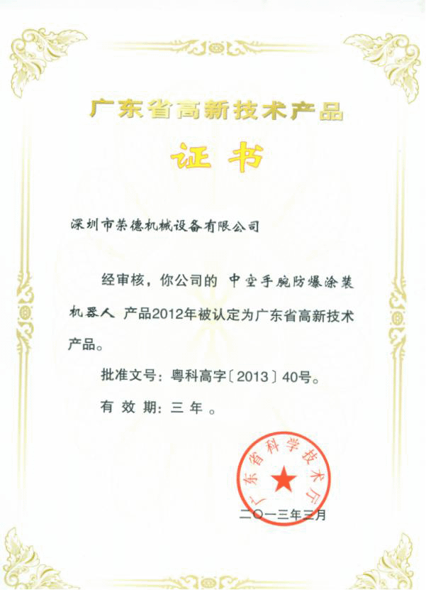 日前,廣東省科技廳公示了獲得“2012年廣東省高新技術產(chǎn)品證書”的企業(yè),深圳市榮德機器人科技自主研發(fā)的噴涂機器人赫然在目。