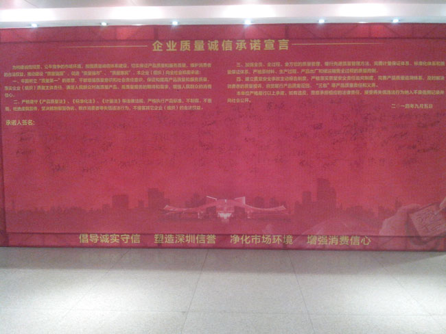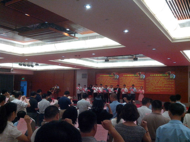 大會的高潮部分是所有與會的企業(yè)代表與政界代表一起舉起右手,宣讀《企業(yè)質(zhì)量誠信承諾書》:為構(gòu)建誠信經(jīng)營、公平競爭的市場環(huán)境,加強質(zhì)量誠信體系建設(shè),切實保證產(chǎn)品質(zhì)量,維護消費者的合法權(quán)益,推動建設(shè)“質(zhì)量強國”,促進“質(zhì)量強市”、“質(zhì)量惠民”。本企業(yè)向社會鄭重承諾:一、牢固樹立“質(zhì)量第一”的思想,不斷增強質(zhì)量意識和社會責(zé)任意識,保證和提高產(chǎn)品質(zhì)量,落實企業(yè)質(zhì)量主體責(zé)任,滿足人們?nèi)罕妼Ω哔|(zhì)量產(chǎn)品的期待和需求,增強人民群眾的消費信心。二、嚴格遵守《產(chǎn)品質(zhì)量法》、《標準化法》、《計量法》等法律法規(guī),嚴格執(zhí)行產(chǎn)品標準,不制假、不售假,杜絕虛假宣傳,堅決抵制假冒偽劣、欺詐消費者等失信違法行為,不侵害其他企業(yè)合法權(quán)益。三、加強全員、全過程、全方位的質(zhì)量管理,推行先進質(zhì)量管理方法,完善計量保證體系、標準化體系和質(zhì)量保證體系,嚴格原材料,生產(chǎn)過程、產(chǎn)品出廠和儲運銷售全過程的照顧質(zhì)量控制。四、建立質(zhì)量安全事故主動報告制度,嚴格落實質(zhì)量安全責(zé)任追究制度,完善產(chǎn)品質(zhì)量追溯體系,及時解決消費者的質(zhì)量投訴,自覺履行產(chǎn)品質(zhì)量召回、“三包”等產(chǎn)品質(zhì)量責(zé)任和義務(wù)。本單位嚴格履行以上承諾。如有違反,愿意承擔(dān)相應(yīng)的法律責(zé)任,接受將失信違法行為納入不良信用記錄并向社會公開。二0一四年九月五日