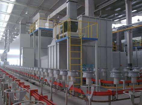 涂裝生產(chǎn)線主要工藝流程是上件→拋丸除銹→清理吹灰→噴鋁→底漆噴漆流平→底漆烘干→中涂噴漆流平→中涂烘干→面漆噴漆流平→面漆噴漆烘干→下件。涂裝線的防腐環(huán)境是室外(不直接淋雨),高架橋腹部波紋板。保護(hù)年限為長(zhǎng)效型,50年。主要針對(duì)工廠構(gòu)件外表面涂漆,不考慮施工后涂裝。前處理拋丸,Sa3.0級(jí)、粗糙度/75-120um、清潔度/1級(jí)?;耐繉訛殡娀釃婁X,120-150μm;底涂層為環(huán)氧富鋅底漆,60-80μm,90℃60分鐘烘干。中間涂層為環(huán)氧云鐵中間漆,150-180μm;90℃90分鐘烘干。 面漆為丙烯酸聚氨酯或氟碳漆面漆,40-60μm。90℃60分鐘烘干??偲崮ず穸龋骸?50μm。